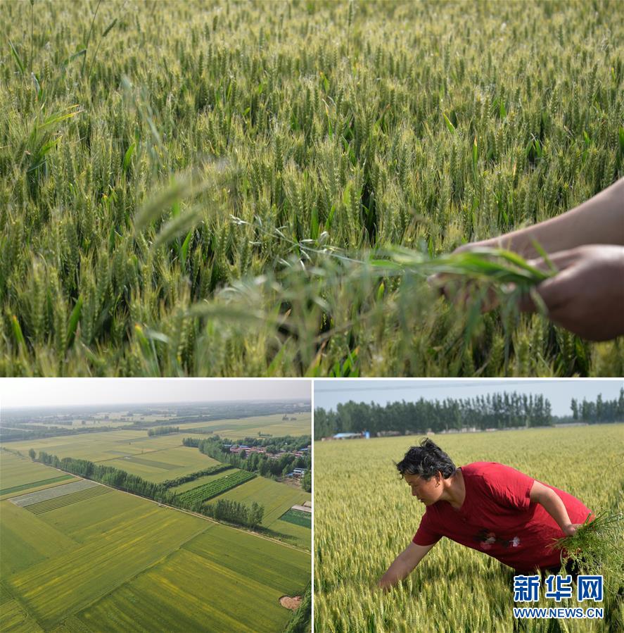 這是一張拼版照片(圖片均為5月16日攝)。上圖、下右圖:在河南省開封市尉氏縣十八里鎮(zhèn)趙崗村,村民郭菊在麥田內(nèi)清除雜草。今年她家流轉(zhuǎn)土地種了18畝小麥,長(zhǎng)勢(shì)良好。下左圖:尉氏縣十八里鎮(zhèn)趙崗村附近集中連片的麥田即將迎來收獲(無人機(jī)照片)。新華社記者孫清清攝