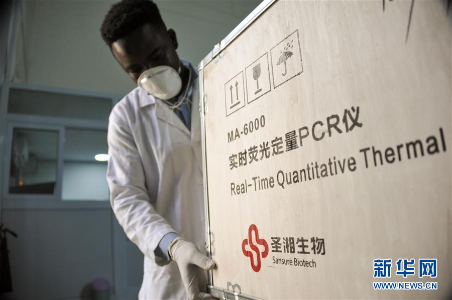 在加納首都阿克拉,加納最大的連鎖藥品供應商mPharma的工作人員展示從中國湖南圣湘生物科技股份有限公司進口的檢測設備(2020年5月6日攝)。新華社記者許正攝