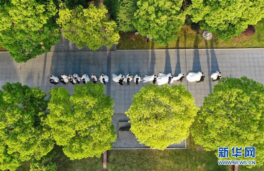 5月19日,新人們在拍攝婚紗照(無人機(jī)照片)。當(dāng)日,15對新人在江蘇南京集體拍攝婚紗照,并將參加5月20日在南京舉行的“今世緣白衣天使集體婚禮”。拍攝婚紗照的部分新人此前因馳援武漢或參加所在城市抗疫工作而推遲婚期。新華社記者季春鵬攝