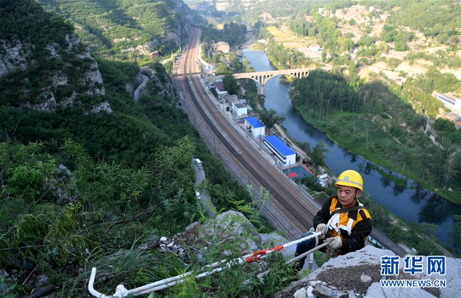 5月21日,捅山工胡軍從山頂垂降,準(zhǔn)備開(kāi)始捅山作業(yè)。新華社記者郝源攝