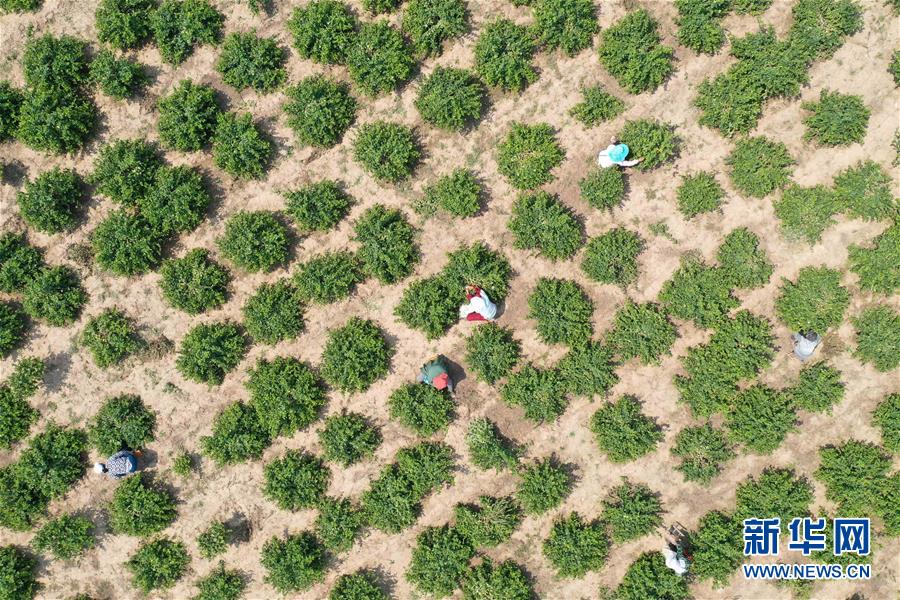 5月21日,河北省清河縣農(nóng)墾金銀花種植專(zhuān)業(yè)合作社社員在采收金銀花(無(wú)人機(jī)照片)。2017年以來(lái),河北省清河縣在推進(jìn)農(nóng)業(yè)產(chǎn)業(yè)結(jié)構(gòu)調(diào)整過(guò)程中,結(jié)合市場(chǎng)需求,立足當(dāng)?shù)赝寥馈夂蛱攸c(diǎn),依托公司“訂單”引導(dǎo)農(nóng)民發(fā)展金銀花種植。目前,清河縣金銀花種植面積近2000畝,帶動(dòng)40多個(gè)村莊的2000余名農(nóng)民人均增收千元以上。新華社記者牟宇攝