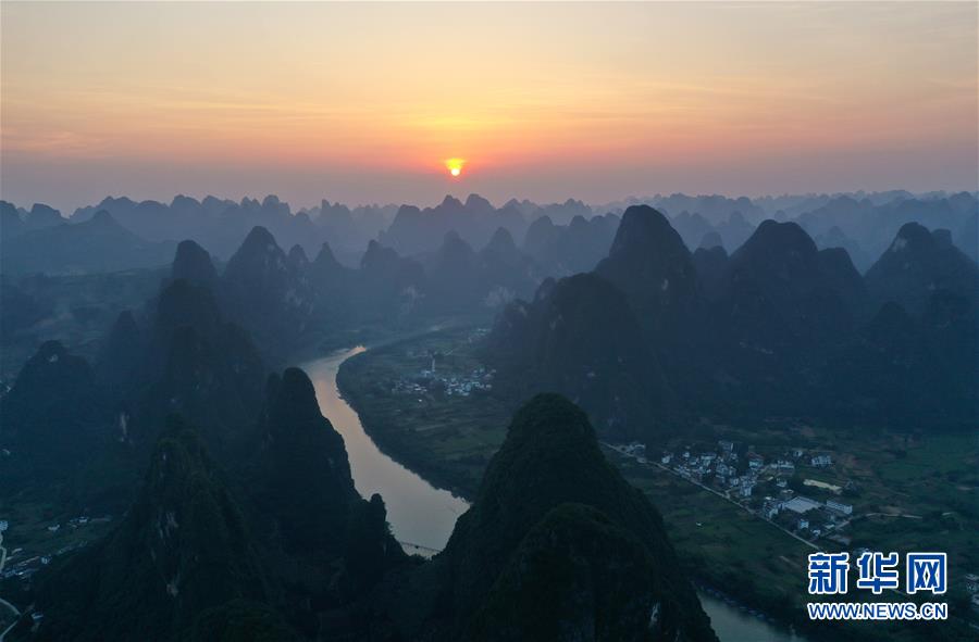 這是在廣西桂林市陽朔縣興坪鎮(zhèn)拍攝的山水風(fēng)光(5月21日攝,無人機(jī)全景照片)?!吧n蒼森八桂,茲地在湘南。江作青羅帶,山如碧玉篸……”一千多年前,唐朝詩人韓愈寫盡桂林山水之美。初夏時(shí)節(jié),在廣西桂林市陽朔縣興坪鎮(zhèn),藍(lán)天白云下,煙雨朦朧中,桂林山水盡顯秀美。新華社記者 周華 攝