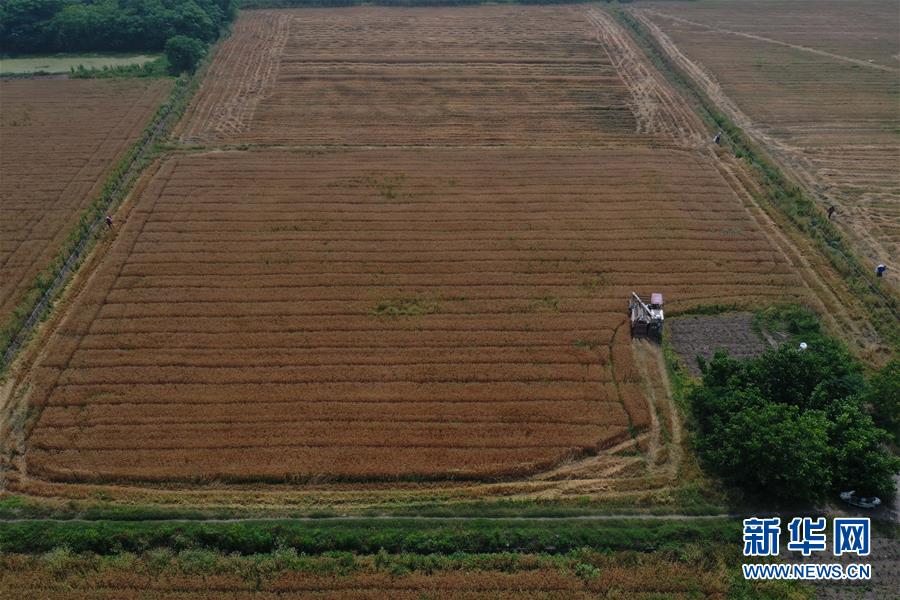 5月24日,農(nóng)戶(hù)駕駛收割機(jī)在浙江省湖州市吳興區(qū)八里店鎮(zhèn)尹家圩糧油植保農(nóng)機(jī)專(zhuān)業(yè)合作社的麥田里進(jìn)行收割作業(yè)(無(wú)人機(jī)照片)。新華社記者黃宗治攝