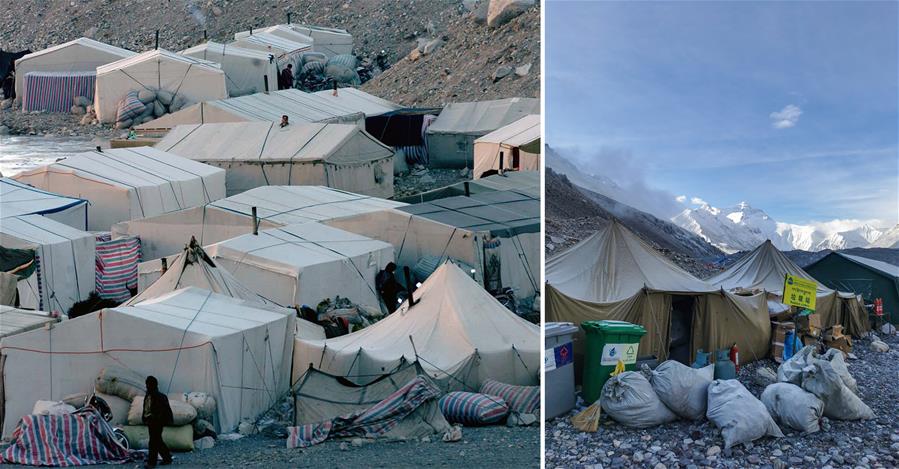 拼版照片:左圖為2005年的春季登山季,為測量、登山和科考等隊(duì)伍提供服務(wù)保障的當(dāng)?shù)厝罕娫谥榉宕蟊緺I搭起的帳篷(資料照片)。新華社記者索朗羅布攝右圖為2020珠峰高程測量活動(dòng)中,曾經(jīng)被視為登山隊(duì)最好的帳篷變成了垃圾集中存放處。新華社記者普布扎西攝