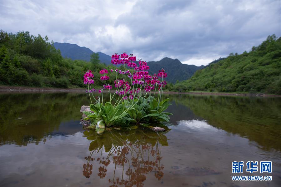 在四川省漢源縣桌子山,一株紅色的報(bào)春花旁生長(zhǎng)著一株白色的報(bào)春花(5月24日攝)。新華社記者江宏景攝