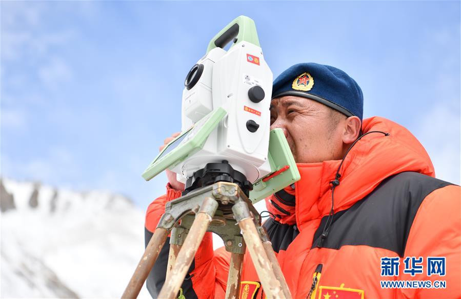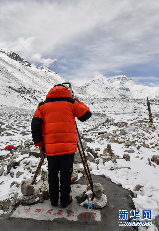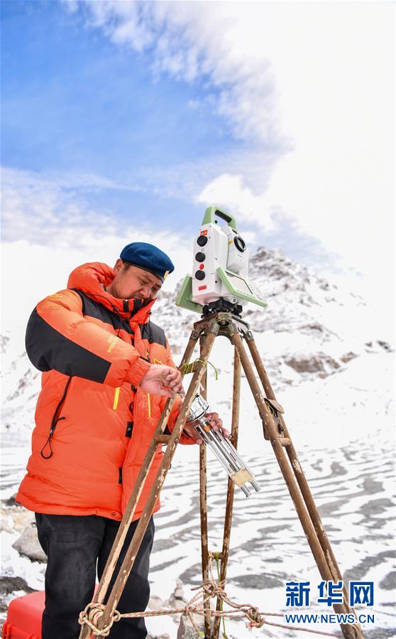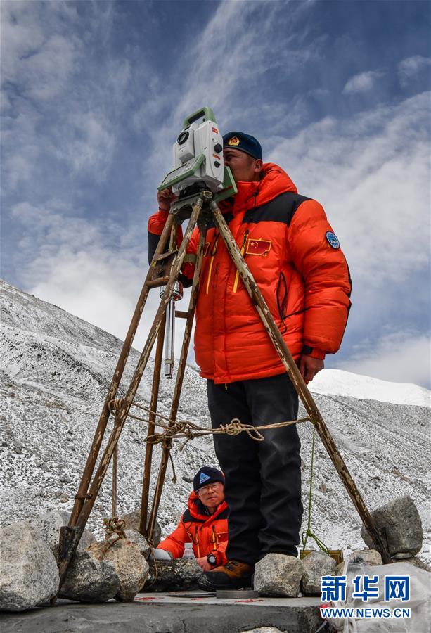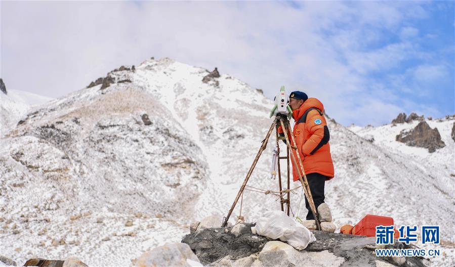 當(dāng)日,2020珠峰高程測(cè)量登山隊(duì)成功登頂后,在珠峰大本營(yíng)的珠峰高程起算點(diǎn),自然資源部第一大地測(cè)量隊(duì)隊(duì)員利用全站儀等儀器對(duì)珠穆朗瑪峰峰頂進(jìn)行交會(huì)觀測(cè)。