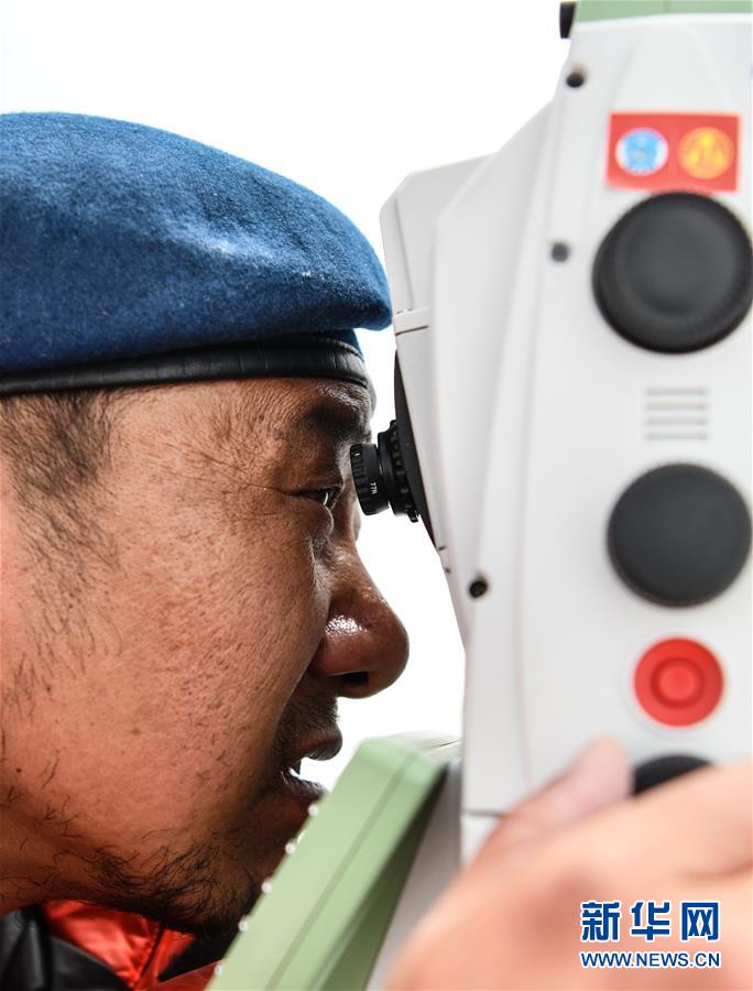 自然資源部第一大地測量隊(duì)隊(duì)員鄭林在使用全站儀對珠峰峰頂進(jìn)行交會觀測(5月27日攝)。新華社記者晉美多吉攝