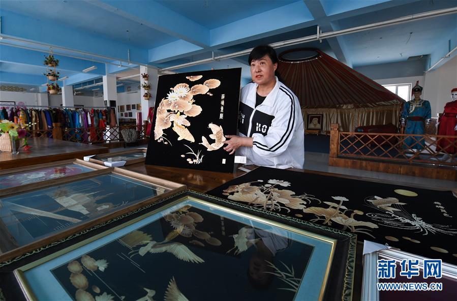5月19日,在新疆博湖縣,一家民族工藝品公司的負責人杜玉新向參觀者介紹蘆葦工藝畫的制作工藝。新華社記者宋彥樺攝