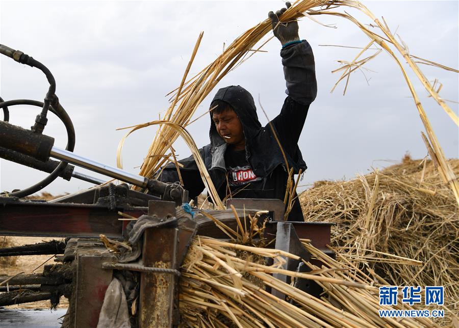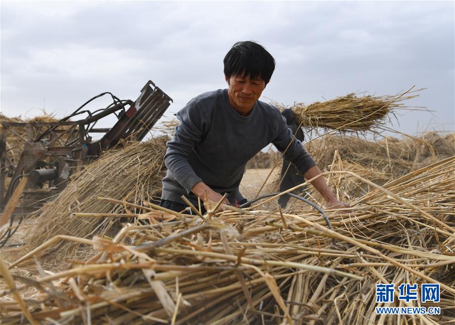5月20日,在新疆博湖縣西南河口葦場,工人將蘆葦打包。新華社記者宋彥樺攝