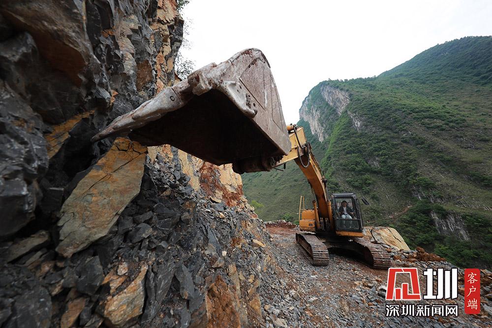 2020年5月27日,在貴州省畢節(jié)市納雍縣化作鄉(xiāng)雙巖頭村,挖掘機在觀音巖的懸崖邊修路。