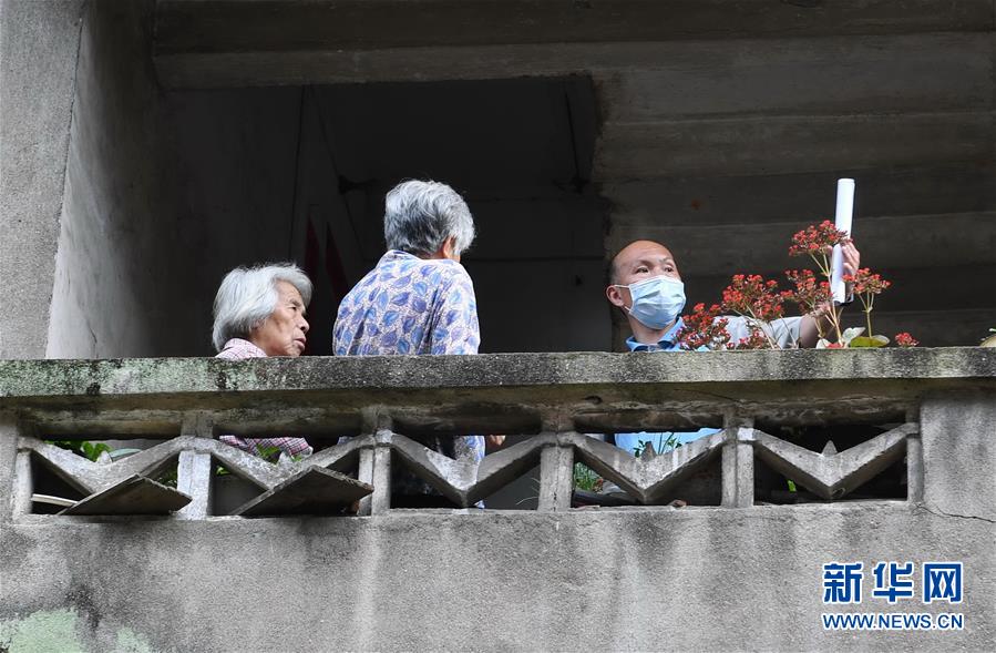 5月27日,福建省閩北地質(zhì)大隊(duì)離退休管理科黨員干部孔祥明(右一)向邵武市通泰街道老舊小區(qū)居民宣傳危房拆遷改造事宜。新華社記者林善傳攝