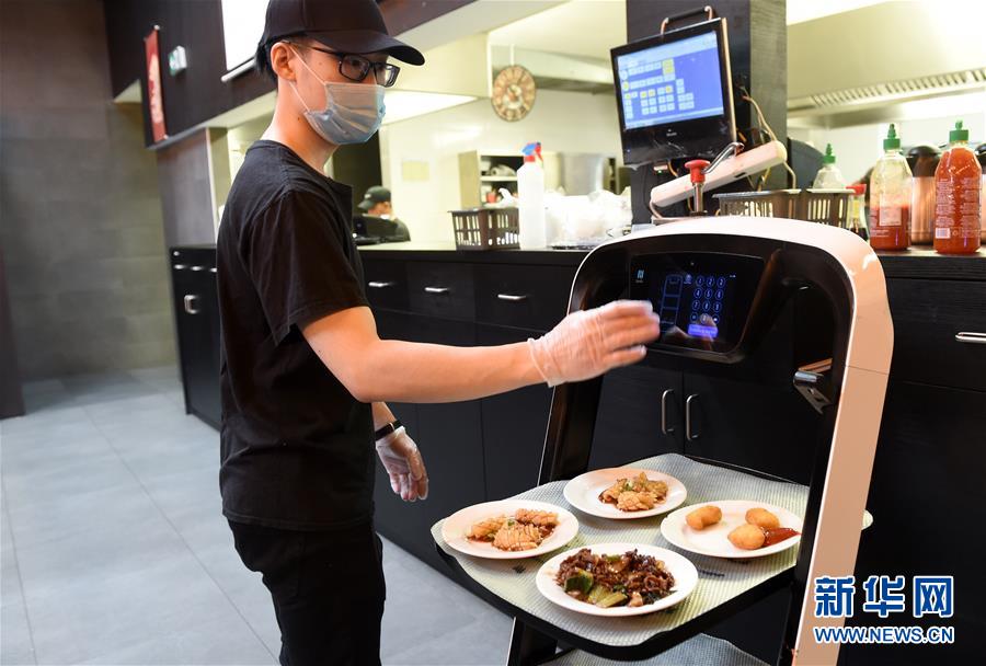 5月28日,在奧地利維也納一家亞洲餐廳內(nèi),服務(wù)員為機(jī)器人設(shè)置送餐桌號(hào)。維也納的一家亞洲餐廳于疫情期間重新?tīng)I(yíng)業(yè)后,更多利用機(jī)器人上菜,以減少服務(wù)員和顧客之間的非必要接觸。新華社記者郭晨攝