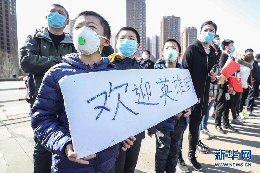 遼寧沈陽一高速公路出口,男孩們列隊歡迎遼寧對口支援襄陽醫(yī)療隊歸來(3月21日攝)。新華社記者潘昱龍攝