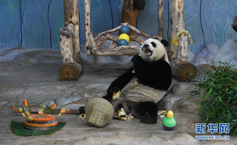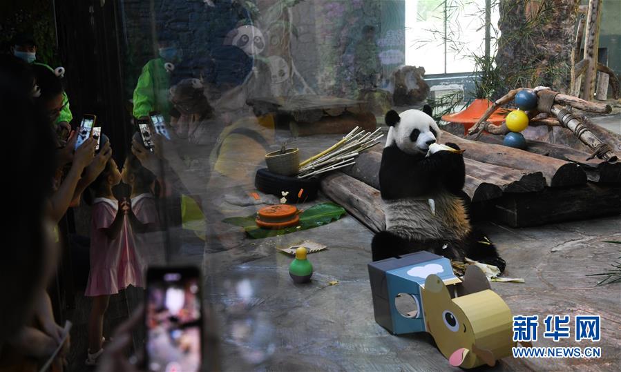 當(dāng)日是“六一”國際兒童節(jié),海南熱帶野生動植物園為園區(qū)內(nèi)的大熊貓“貢貢”“舜舜”準(zhǔn)備了美食和玩具,與小朋友們一同歡度節(jié)日。
