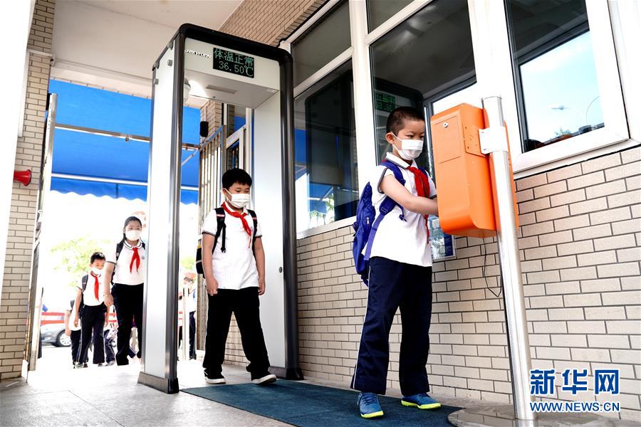 6月2日,上海閔行區(qū)鑫都小學的學生走進校園。當日,上海小學一、二、三年級學生返校開學。新華社記者張建松攝。