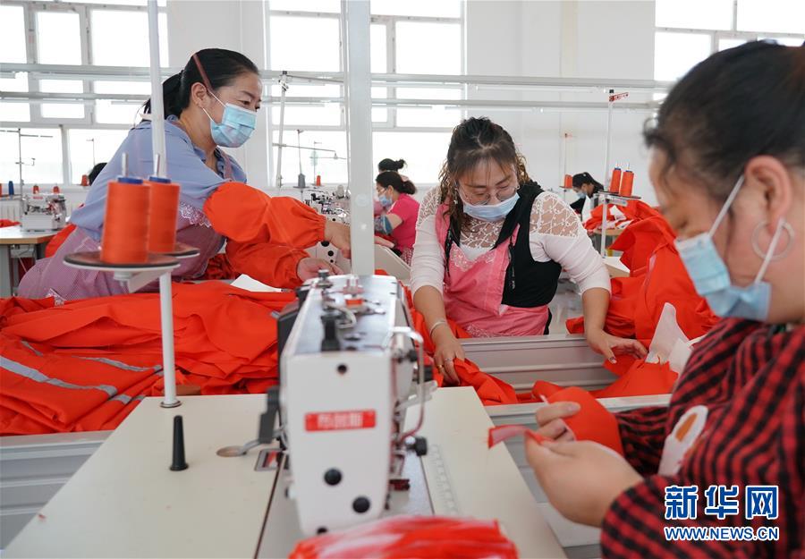 6月2日,工人在尚義縣大青溝鎮(zhèn)的易地扶貧搬遷集中安置小區(qū)附近一家扶貧工廠工作。