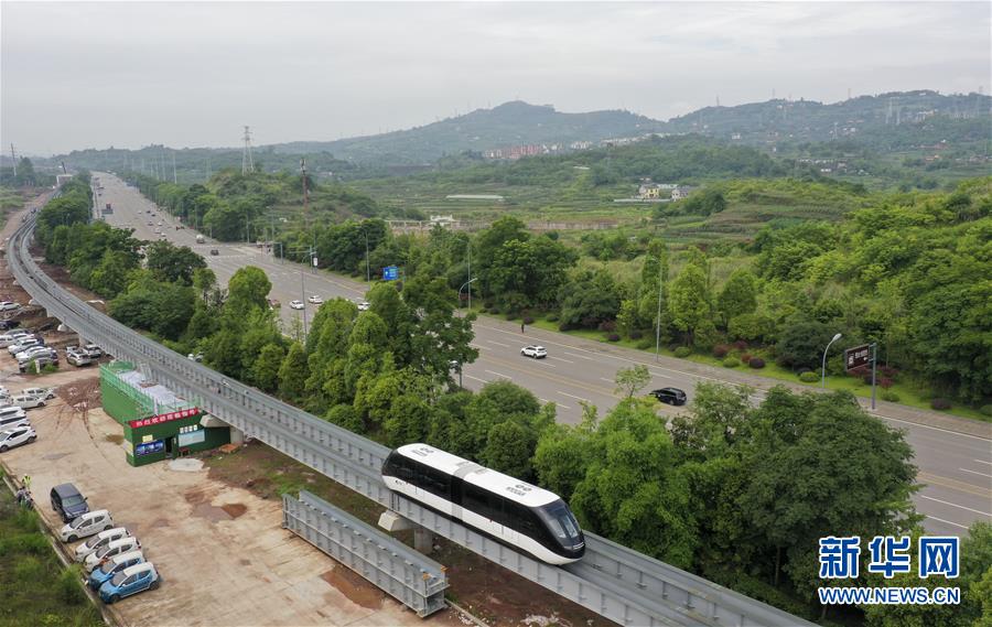 6月3日,一臺“云巴”在專用運行軌道上進行調試(無人機照片)。近日,重慶市首條“云巴”示范線項目在重慶璧山區(qū)正式亮相。此次發(fā)布的“云巴”采用電能驅動,具有轉彎半徑小、爬坡能力強、噪音低、安全性高、建設成本低、建造周期短等優(yōu)勢,能為乘客提供更智能、舒適、便捷的出行體驗。據(jù)介紹,璧山區(qū)“云巴”示范線項目自2019年8月開建,線路正線全長15.4km,共設車站15座,預計2020年9月全線通車。新華社記者劉潺攝。