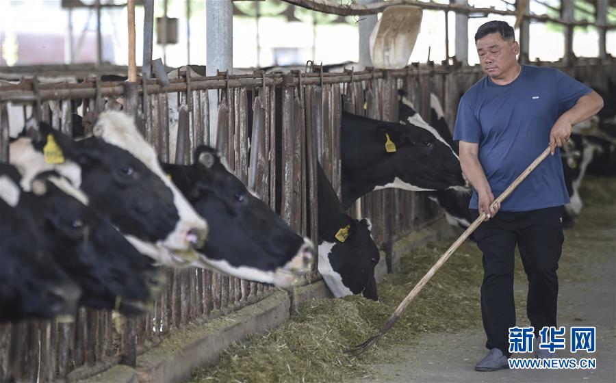 6月3日,村民在深州市榆科鎮(zhèn)郝家莊村奶牛養(yǎng)殖扶貧基地飼喂奶牛。今年以來,河北省深州市圍繞決勝全面小康、決戰(zhàn)脫貧攻堅任務(wù)目標(biāo),在推進產(chǎn)業(yè)扶貧的過程中注重激發(fā)內(nèi)生動力,通過電商扶貧、扶貧車間、特色種植養(yǎng)殖等多種形式,提升自我“造血”功能,提高貧困群眾受益度。新華社記者李曉果攝。