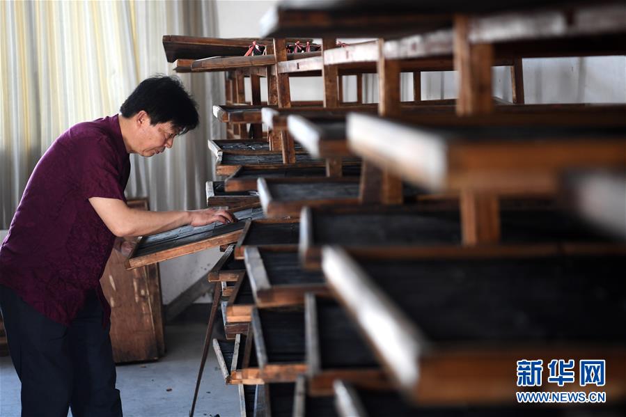 5月20日,安徽省非物質文化遺產徽墨代表性傳承人項德勝在查看通風晾制的墨。新華社記者劉軍喜攝。