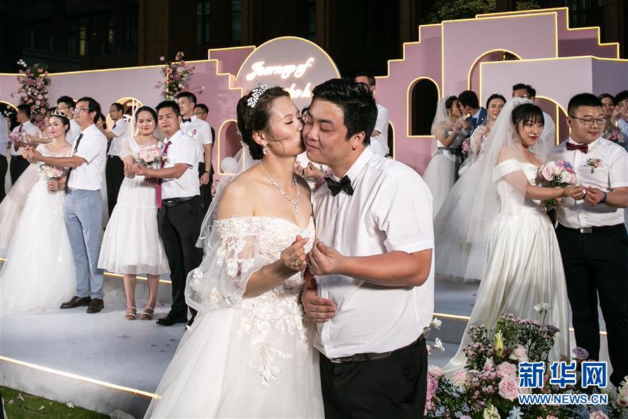 6月6日,新人在海南博鰲樂(lè)城國(guó)際醫(yī)療旅游先行區(qū)參加集體婚禮。 新華社記者 張麗蕓 攝