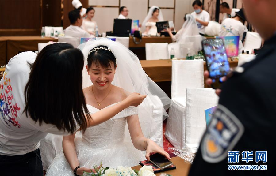 6月6日,海南省萬寧市公安局疫情防控指揮部民警騰凱彪在為正在化妝的妻子侯俊霞拍照。 當(dāng)日,來自全國15個省份的百對新人在三亞市亞特蘭蒂斯度假區(qū)舉行了一場特殊的集體婚禮,每對新人中至少有一位參與過抗擊新冠肺炎疫情的工作。 新華社記者 郭程 攝