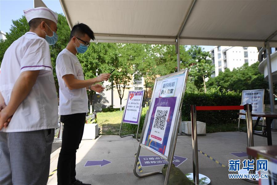 6月6日,在清華大學(xué)一個學(xué)生食堂門前,一名返校學(xué)生按要求掃碼驗(yàn)證信息。 新華社記者 鞠煥宗 攝