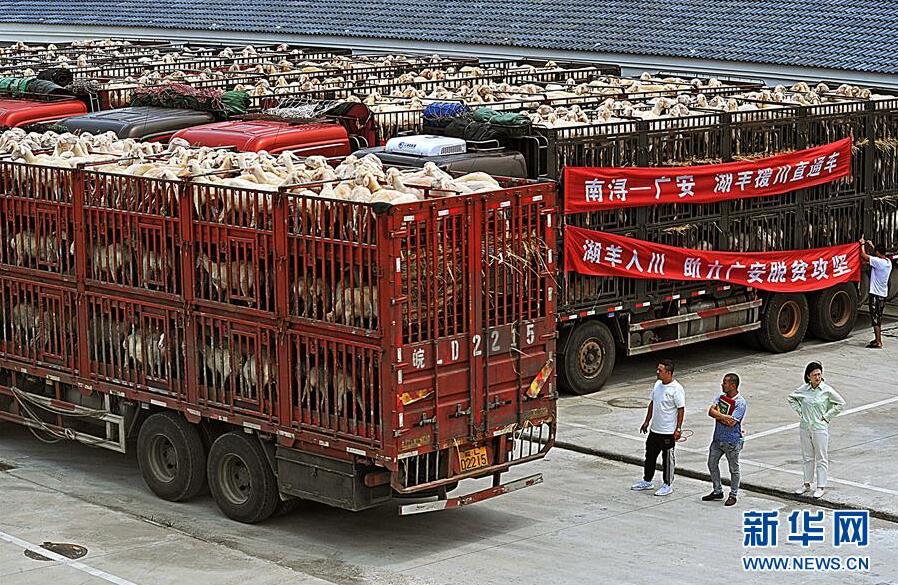 6月7日,南潯區(qū)一家湖羊養(yǎng)殖場(chǎng)的工人在裝運(yùn)湖羊。當(dāng)日,浙江省湖州市南潯區(qū)湖羊養(yǎng)殖場(chǎng)飼養(yǎng)的五千余頭湖羊啟程運(yùn)往該區(qū)對(duì)口幫扶的四川省廣安市廣安區(qū)。2018年以來(lái),南潯區(qū)依托湖羊養(yǎng)殖產(chǎn)業(yè)優(yōu)勢(shì),積極實(shí)施“湖羊入川”和“湖羊致富”工程,向?qū)趲头龅貐^(qū)提供優(yōu)質(zhì)湖羊種羊和湖羊養(yǎng)殖技術(shù)指導(dǎo)。截至目前,南潯區(qū)已向廣安等地提供1.2萬(wàn)余頭扶貧湖羊。新華社記者譚進(jìn)攝