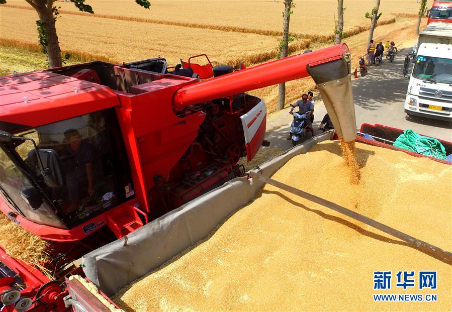 6月8日,在河北省南和縣閆里鄉(xiāng)閆里村,農(nóng)民將收獲的小麥裝車(無人機(jī)照片)?!叭摹逼陂g,河北省預(yù)計(jì)組織和調(diào)度小麥聯(lián)合收割機(jī)、拖拉機(jī)、夏玉米播種機(jī)等200萬臺農(nóng)業(yè)機(jī)械投入作業(yè)。新華社記者朱旭東攝