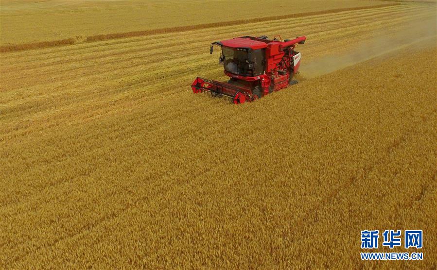 6月8日,聯(lián)合收割機(jī)在河北省南和縣閆里鄉(xiāng)閆里村麥田進(jìn)行夏收作業(yè)(無(wú)人機(jī)照片)?!叭摹逼陂g,河北省預(yù)計(jì)組織和調(diào)度小麥聯(lián)合收割機(jī)、拖拉機(jī)、夏玉米播種機(jī)等200萬(wàn)臺(tái)農(nóng)業(yè)機(jī)械投入作業(yè)。新華社記者朱旭東攝