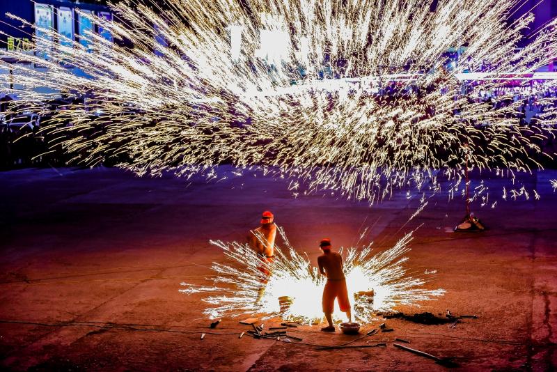 2020年6月7日晚8時(shí)許,吉林長(zhǎng)春青岡立交橋附近,打鐵花時(shí),先把熔好的鐵汁注入事先準(zhǔn)備好的“花棒”。一個(gè)拳頭粗細(xì)、一尺多長(zhǎng)的柳樹棒,棒的頂端掏有直徑3厘米的圓形坑槽,用以盛放鐵汁。打鐵花者一手拿著盛有鐵汁的“花棒”,用下棒猛擊盛有鐵汁的上棒,使棒中鐵汁沖向花棚,鐵汁遇到棚頂?shù)牧Χ派⒊鼍薮蟮幕鸹?。五彩繽紛、震天動(dòng)地。