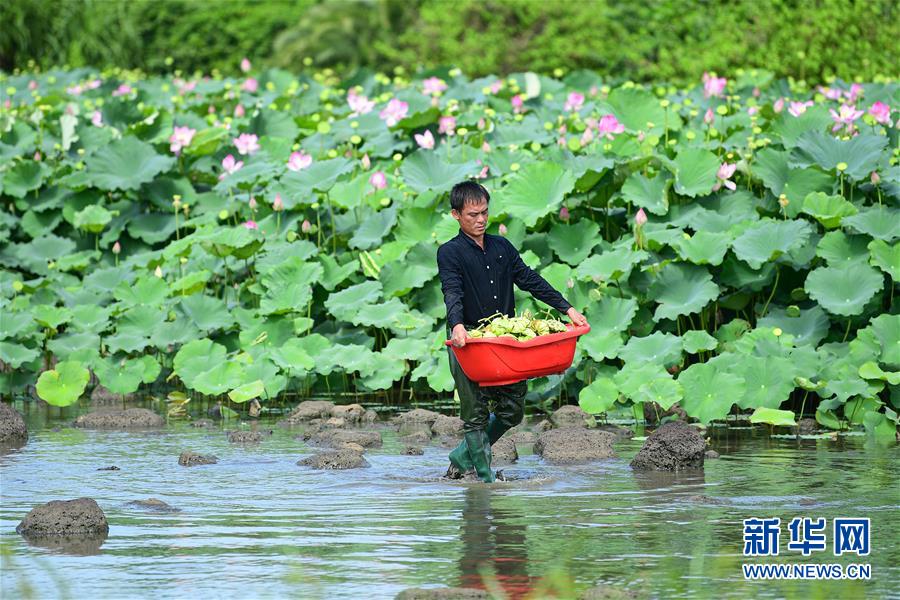6月9日,村民在海口龍華區(qū)龍泉鎮(zhèn)椰子頭村搬運(yùn)采摘的蓮蓬。初夏時(shí)節(jié),位于海南??邶埲A區(qū)龍泉鎮(zhèn)的蓮蓬逐漸成熟,當(dāng)?shù)卮迕窦泳o采摘,一派繁忙景象。新華社記者蒲曉旭攝