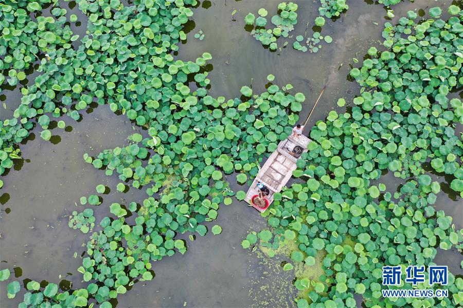 6月9日,在宿遷市宿城區(qū)中揚(yáng)鎮(zhèn)一家淺水藕套養(yǎng)小龍蝦合作社,工人在給小龍蝦喂飼料(無(wú)人機(jī)照片)。