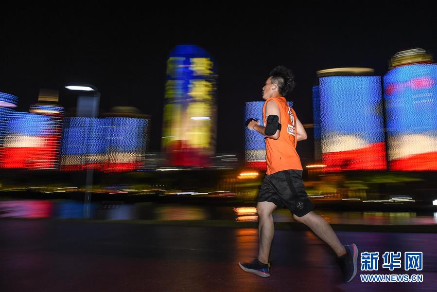 一位市民在??谌f綠園夜跑(5月15日拍攝)。近年來,夜跑成為越來越多都市人熱衷的健身方式之一。在海南???,每當夜幕降臨,“夜跑族”來到海口萬綠園、世紀公園等夜跑場所跑步,用一身酣暢淋漓的汗水擺脫白天工作中的壓力,享受跑步帶來的歡愉。新華社記者 蒲曉旭 攝