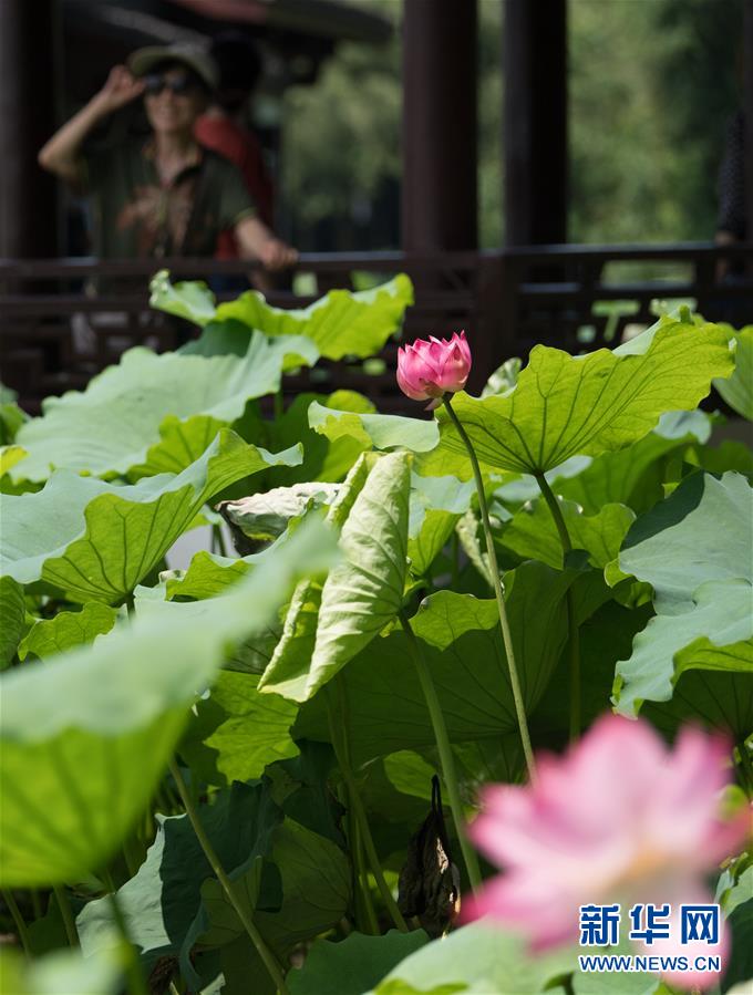 6月12日,游人在西湖郭莊觀看荷展。隨著氣溫升高,杭州西湖荷花次第開放,引得游人駐足。新華社記者 翁忻旸 攝