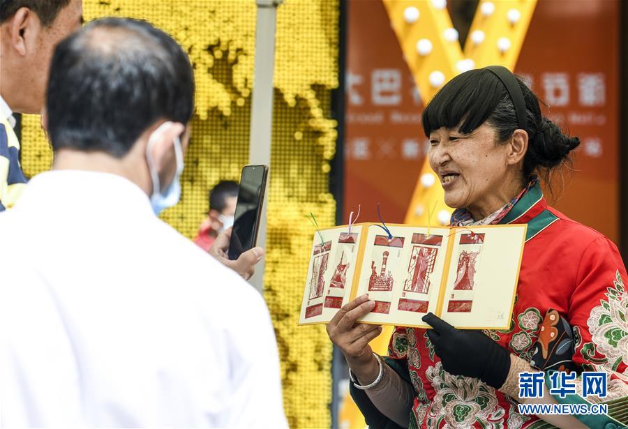 6月12日,在位于烏魯木齊大巴扎景區(qū)內(nèi)的活動(dòng)現(xiàn)場,手藝人、新疆剪紙技藝傳承人王革(右)向參觀者展示國家級非物質(zhì)文化遺產(chǎn)——中國剪紙。6月12日,“文旅融合,文物賦彩,非遺傳承,健康生活”2020年烏魯木齊市天山區(qū)文化和自然遺產(chǎn)日推介展演活動(dòng)在大巴扎景區(qū)舉辦,吸引不少游客和市民觀賞。新華社記者王菲攝。