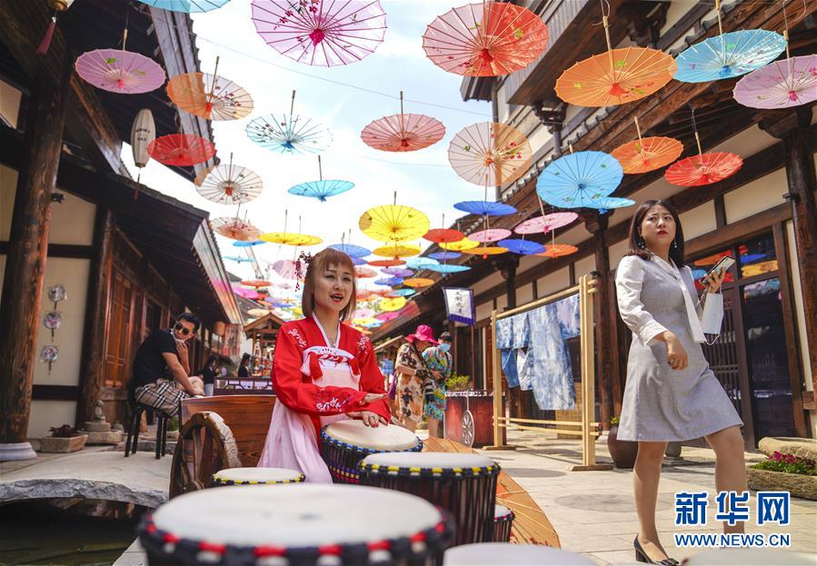 6月13日,在長春市世茂蓮花山小鎮(zhèn)寬厚里商街,一名古裝愛好者演奏手鼓。當日是“文化和自然遺產日”。吉林長春首屆蓮花山消夏生活節(jié)在世茂蓮花山小鎮(zhèn)舉行。活動將非遺展示與假日消暑休閑相結合,讓游人在“古色古香”的油紙傘巷中品傳統(tǒng)文化魅力,享夏日休閑愜意。新華社記者許暢攝。