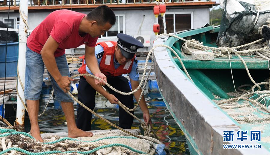 6月13日,海南省公安廳海岸警察總隊(duì)(籌備組)陵水支隊(duì)民警幫助轄區(qū)內(nèi)漁民固定漁排。當(dāng)日,海南省氣象局于16時(shí)30分繼續(xù)發(fā)布臺(tái)風(fēng)四級(jí)預(yù)警。今年第2號(hào)臺(tái)風(fēng)“鸚鵡”(熱帶風(fēng)暴級(jí))預(yù)計(jì)于14日在廣東沿海登陸。新華社記者楊冠宇攝。