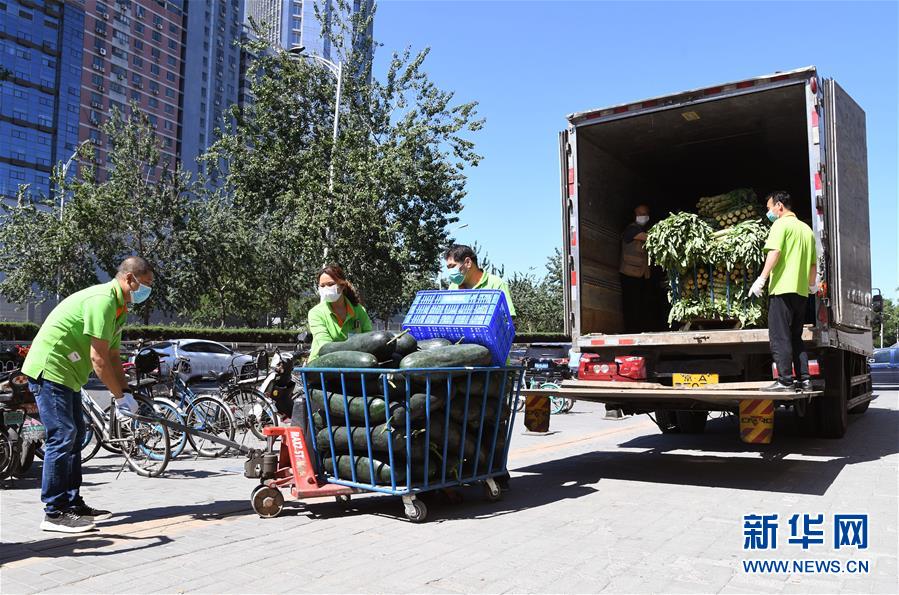 6月14日,在北京市海淀區(qū)的超市發(fā)雙榆樹店門口,工作人員在搬運(yùn)蔬菜。  新華社記者 任超 攝