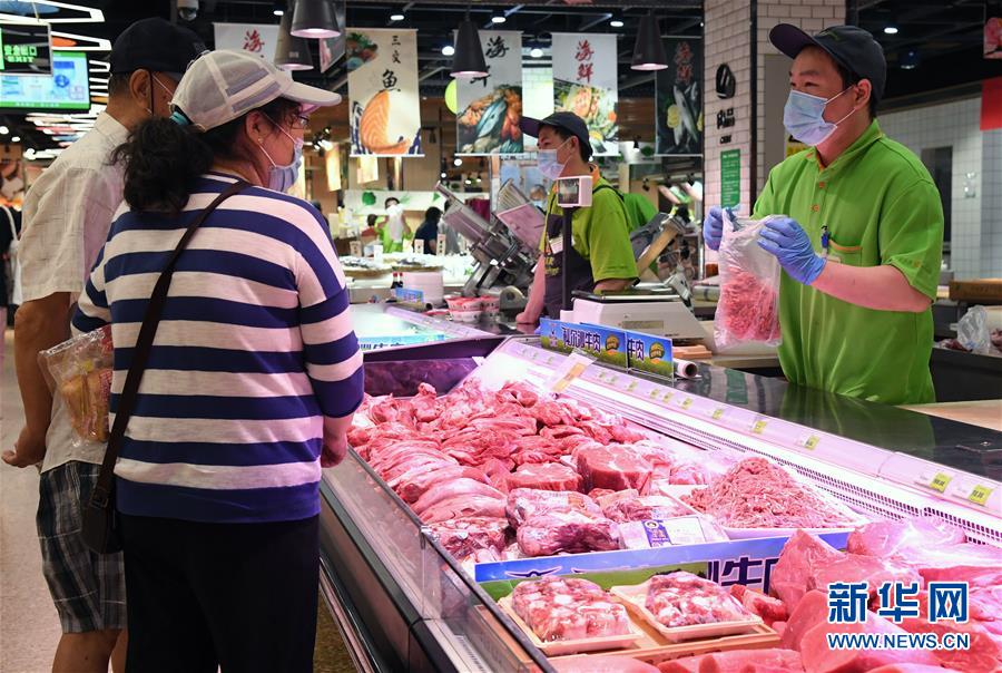 6月14日,在北京市海淀區(qū)的超市發(fā)雙榆樹店,市民在挑選鮮肉。  新華社記者 任超 攝