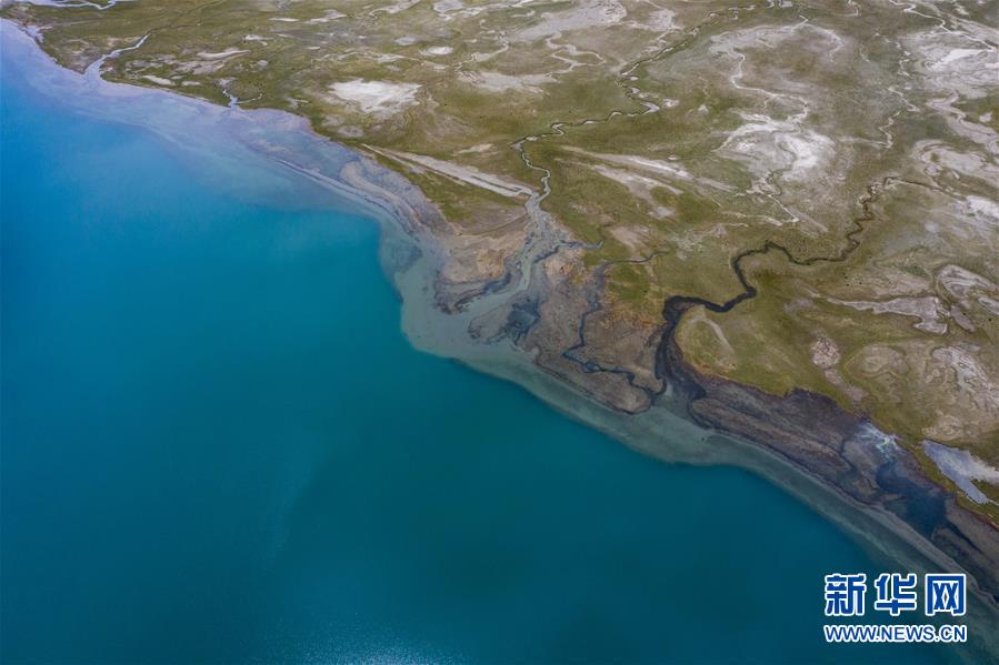 帕米爾高原上的喀拉庫(kù)勒湖及湖畔濕地一景(6月16日攝,無(wú)人機(jī)照片)。新華社記者 胡虎虎 攝