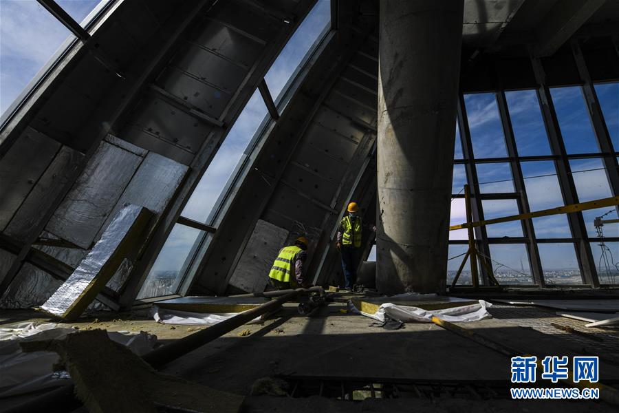 6月16日,工人在新疆烏魯木齊奧林匹克體育中心運(yùn)動員賓館內(nèi)施工。新華社記者 王菲 攝