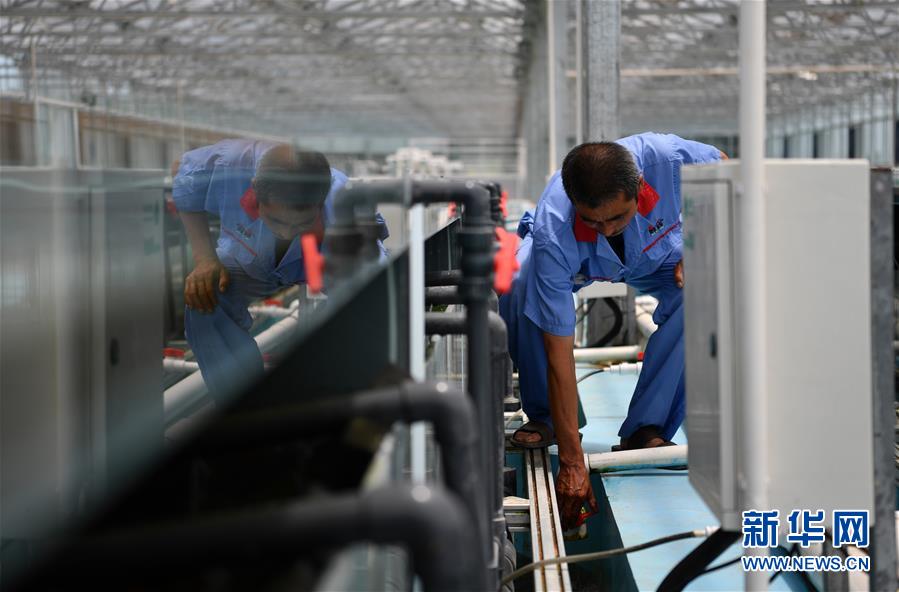 在天津現(xiàn)代晨輝科技集團(tuán)有限公司的養(yǎng)殖示范場,工人在調(diào)試設(shè)備(6月15日攝)。新華社記者 李然 攝