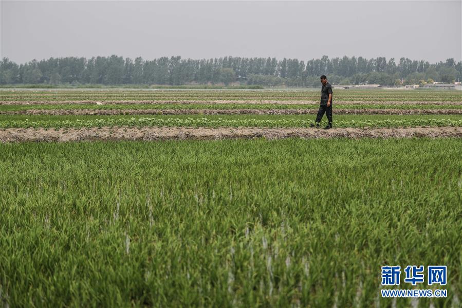 6月17日,農(nóng)民在盤(pán)錦市盤(pán)山縣太平街道張家村的稻田間查看水稻秧苗生長(zhǎng)情況。新華社記者 潘昱龍 攝