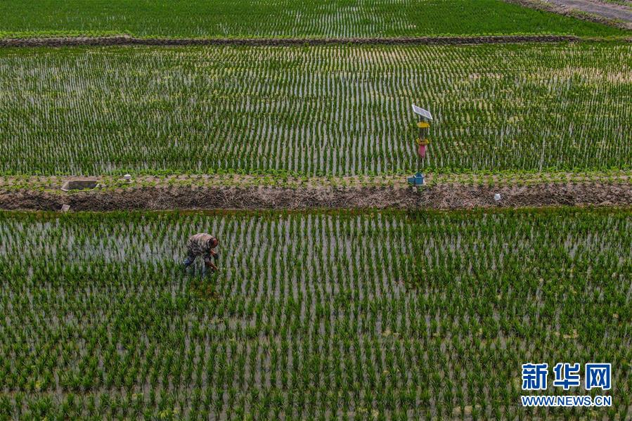 6月17日,農(nóng)民在盤(pán)錦市盤(pán)山縣太平街道張家村稻田間進(jìn)行管護(hù)作業(yè)。新華社記者 潘昱龍 攝