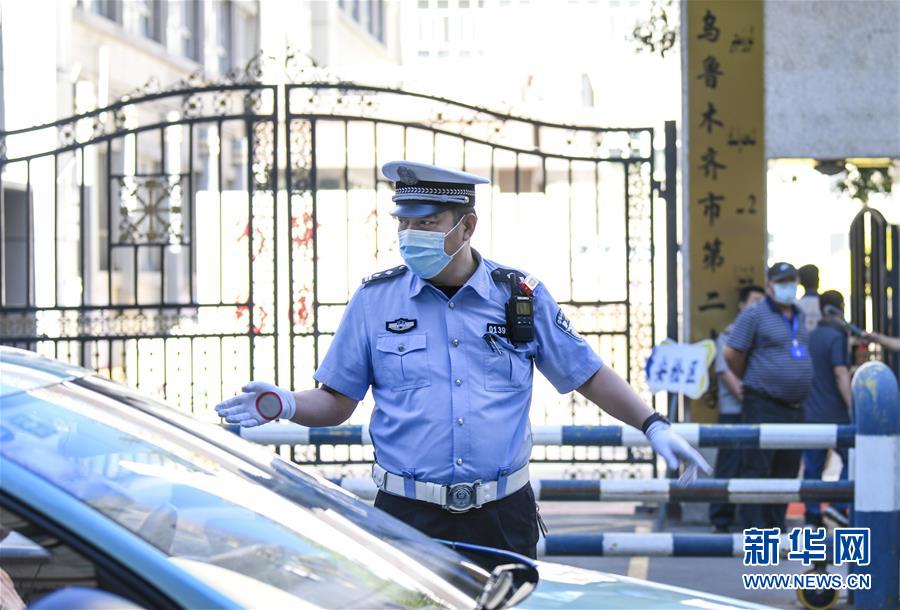 6月20日,在烏魯木齊市第二中學(xué)門前,烏魯木齊市公安局交警支隊天山區(qū)大隊新華路中隊警官艾力夏提·哈力木然提在指揮交通。當日,烏魯木齊市初中升高中考試開始。為保障為期三天的中考順利進行,烏魯木齊市公安局交警支隊在各考點執(zhí)勤,為考生保駕護航新華社記者 王菲 攝