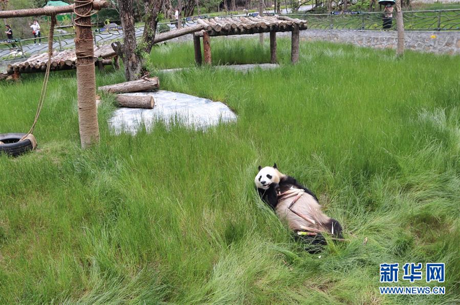 在位于四川省阿壩藏族羌族自治州的九寨溝大熊貓園,大熊貓“海海”在打滾(6月19日攝)。新華社記者沈伯韓攝