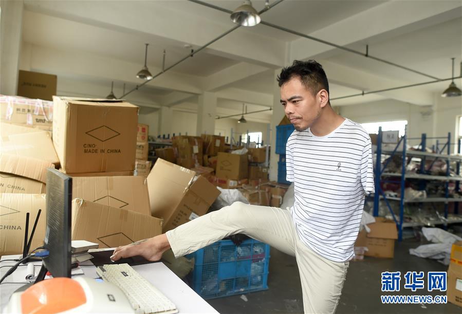 6月12日,金江偉用腳控制鼠標(biāo)打印網(wǎng)店訂單。今年34歲的金江偉是浙江省諸暨市楓橋鎮(zhèn)樂(lè)山村村民。5歲時(shí)的一場(chǎng)意外讓他失去了雙臂,但金江偉沒有向命運(yùn)屈服。從2016年起,金江偉和弟弟開始在電商領(lǐng)域創(chuàng)業(yè),開網(wǎng)店銷售襪子,金江偉負(fù)責(zé)網(wǎng)店策劃和客服。經(jīng)過(guò)苦練,他用腳打字的速度已經(jīng)與常人無(wú)異。在他的努力下,這幾年網(wǎng)店年銷售額超過(guò)100萬(wàn)元。新華社記者韓傳號(hào)攝