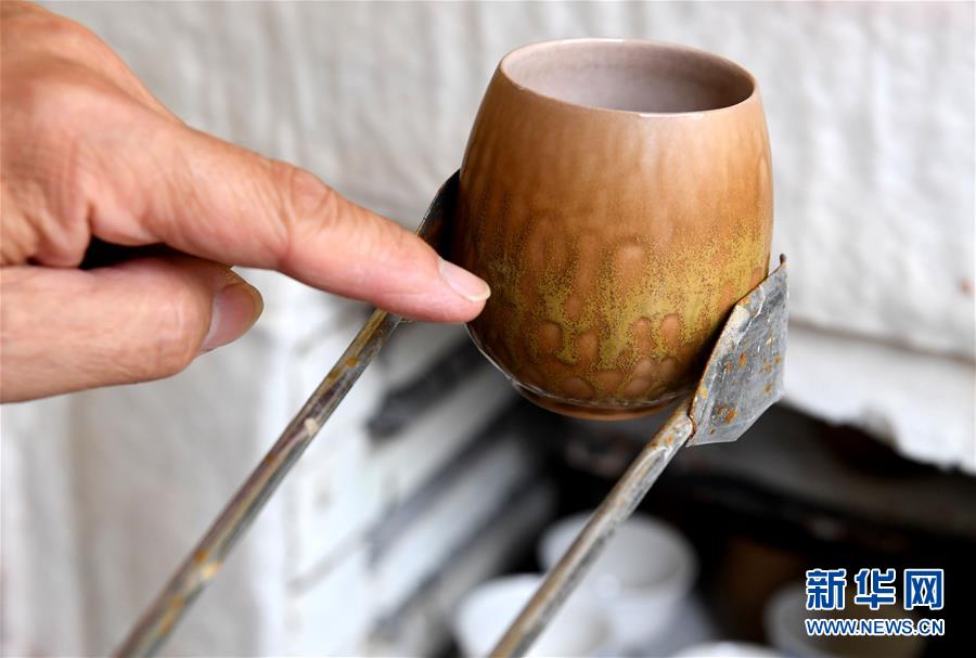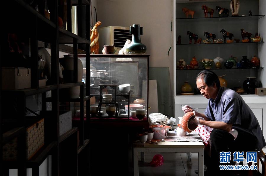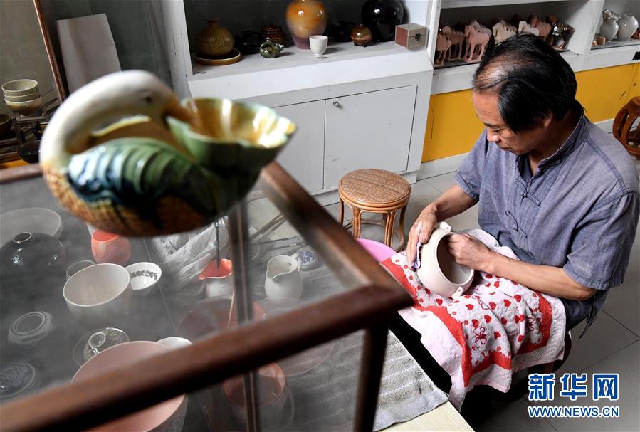 在河南省鞏義市站街鎮(zhèn)小黃冶村的工作室里,游光明在施釉(6月19日攝)。新華社記者李安攝