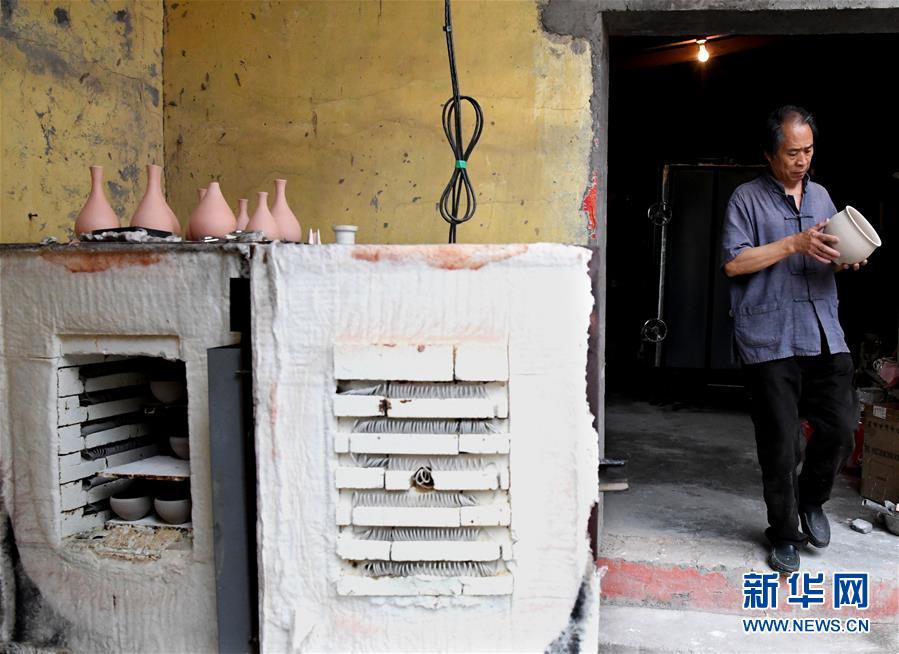 在河南省鞏義市站街鎮(zhèn)小黃冶村的工作室里,游光明在拉坯(6月19日攝)。新華社記者李安攝