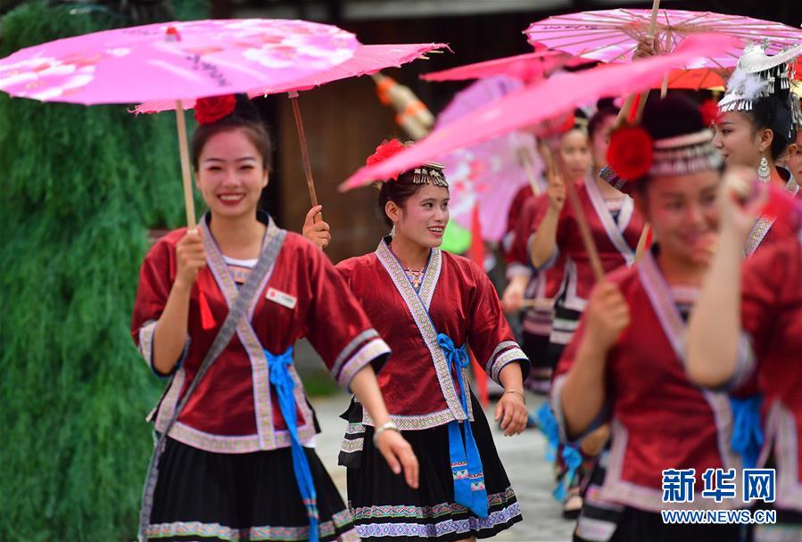 在廣西融水雙龍溝森林旅游度假區(qū)夢(mèng)嗚苗寨,搬遷過來的苗族姑娘準(zhǔn)備給游客表演民族舞蹈(6月21日攝)。近年來,融水打造原生態(tài)苗族文化體驗(yàn)園——夢(mèng)嗚苗寨,讓搬遷進(jìn)城的貧困戶住進(jìn)復(fù)原建設(shè)的老房子。景區(qū)提供綠化保潔、游樂設(shè)施管理、民族歌舞表演等工作崗位,多渠道增加貧困戶收入。新華社記者黃孝邦攝